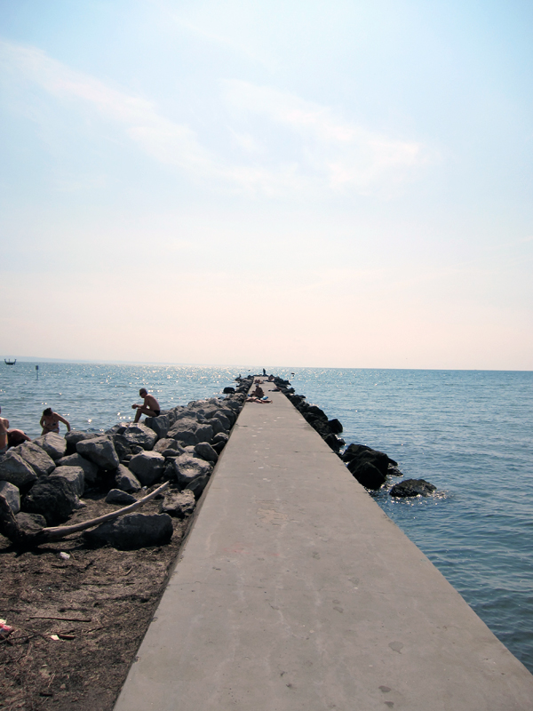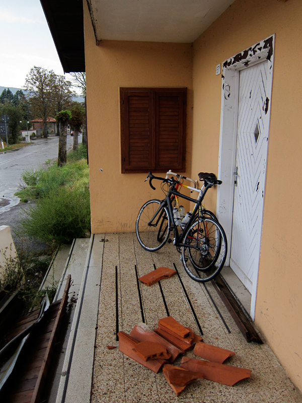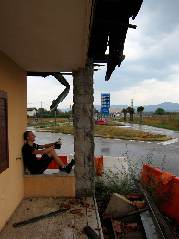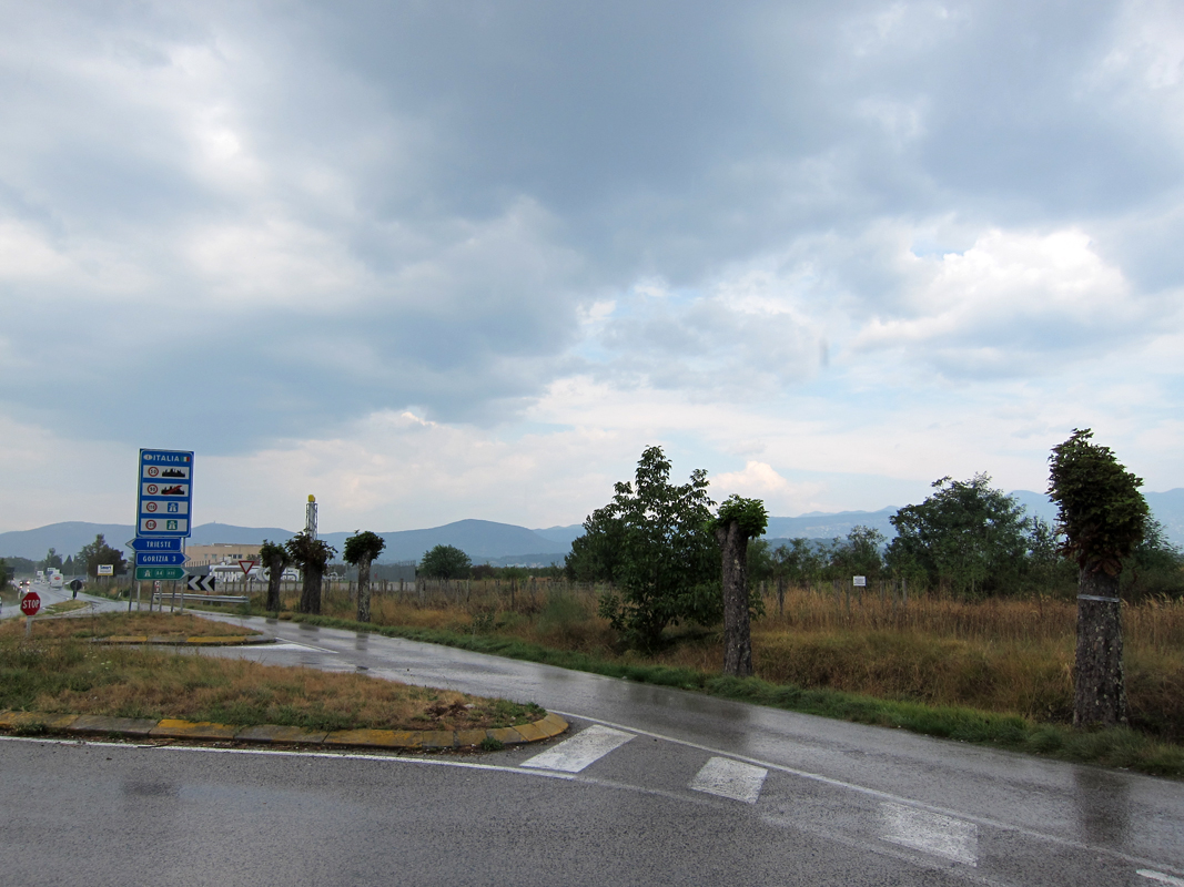 So ging es zur Adria, durch die Bucht nach Grado (eine Touristenhochburg) und an die Grenze zu Slowenien. Dort änderte sich nicht nur die Landschaft, sondern wir bekamen Besuch vom Regen und das nicht zu knapp. Erzwungene Pausen in Ruinen können aber auch ganz nett sein. Dafür war der Weg durch kleine Hügel, Weinanbaugebiete und der Blick auf die großen Berge eine gute Entschädigung. Wer selber schon einmal in Italien war, wird sicher auch die vielen Agriturismo-Restaurants kennen, bei denen es fast nur selbst angebautes Gemüse, Fleisch aus der kleinen Freilandhaltung, eigene Öl, eigene Weine oder selbst gemachte Pasta gibt. Ein Traum an gutem Essen.